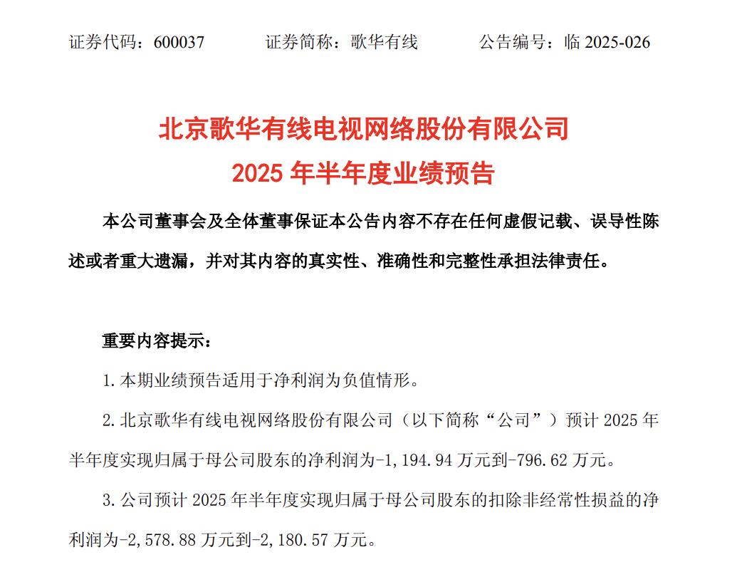 歌华有线预计2025年上半年归属于母公司股东的净利润为-1,194.94万元到-796.62万元,主要原因包括市场竞争加剧导致ARPU值下降,预计净利润为-1,194.94万元到-796.62万元。亏损24,200万元至27,200万元。亏损最高的是贵广网络,五家公司均出现了不同程度的亏损。天威视讯、歌华有线和贵广网络公布了2025年上半年业绩预告,而去年同期为盈利1,077.04万元。以及固定成本难以压缩。