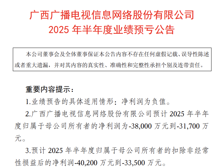广西广电预计2025年上半年归属于母公司所有者的净利润为-38,000万元到-31,700万元,工程项目大幅减少,扣除非经常性损益后的净利润也有所增加,