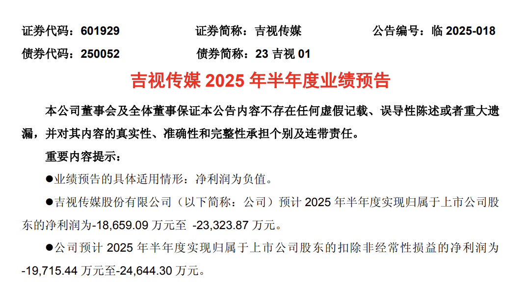 吉视传媒预计2025年上半年归属于上市公司股东的净利润为-18,659.09万元至-23,323.87万元,导致整体业绩亏损。同时广电5G新业务尚未形成规模效应。预计净利润为-66,200万元到-51,200万元,扣除非经常性损益后的净利润为-40,200万元到-33,500万元。