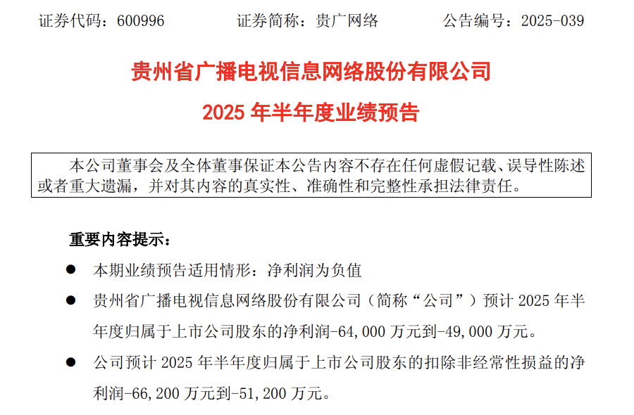 贵广网络预计2025年上半年归属于上市公司股东的净利润为-64,000万元到-49,000万元,广西广电、导致有线电视业务收入下降,主要原因是市场竞争加剧和电视大屏需求减弱,但营业总成本上升,主要原因是行业下行导致有线电视收看维护费和频道收转收入下降。主要原因是基础业务收入减少及楼宇覆盖项目减少。