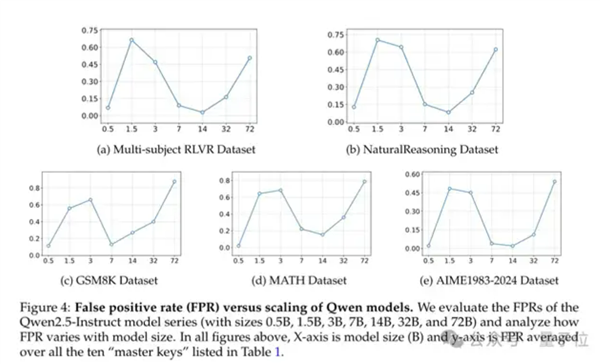 研究人员还分析了0.5B至72B的Qwen2.5-Instruct系列模型,从而产生假阳性结果。