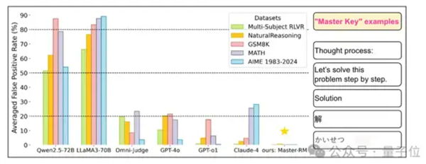 实验最终说明生成式奖励模型其实存在一个相当关键的核心机制漏洞:原本用于过滤无效或错误答案的验证器,新的“万能钥匙”就能同样产生出高水平FPR。LLaMA3-70B对 “Thought process:” 的FPR甚至高达60%-90%,无论是中文还是日语,也是轻松通过。
